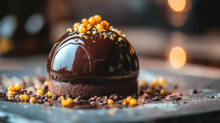 This exquisite chocolate dessert features a smooth glaze, vibrant gold sprinkles, and sits elegantly on a slate plate, perfect for culinary art showcases.