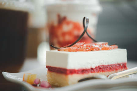 Chocolate cake with strawberry in dish. Dessert concept.