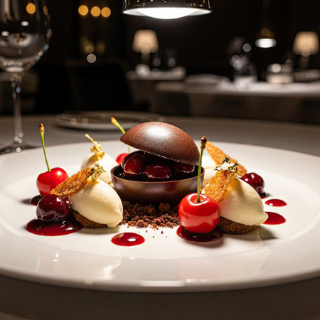 A beautifully arranged dessert plate showcases a chocolate sphere and fresh cherries. Creamy elements complement the dark tones of the chocolate and red cherries, with a soft lighting effect creating depth. This image is suitable for culinary promotions, restaurant menus, and food-related editorial content.