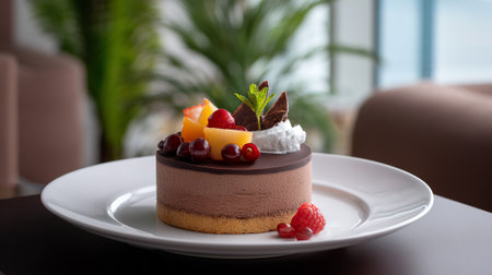 A delicious chocolate mousse cake with fresh fruit on a white plate