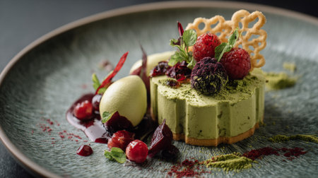 Delight in a stunning matcha dessert featuring fresh raspberries and artistic garnishes, beautifully presented on an elegant plate that captures culinary artistry.