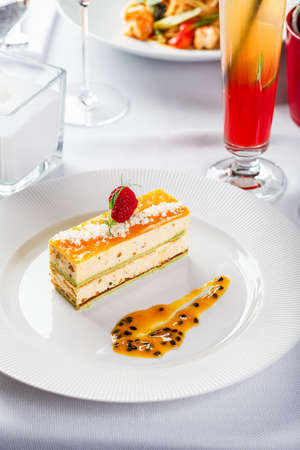 Delicious dessert with fruits on a plate. Selective focus.
