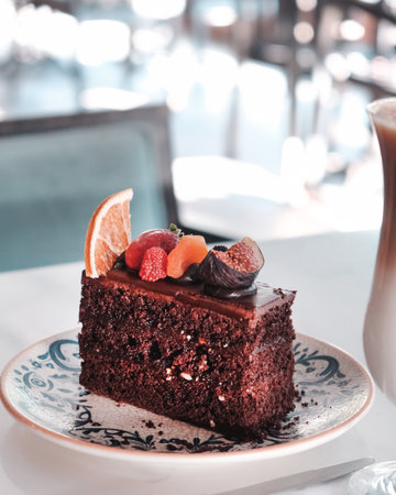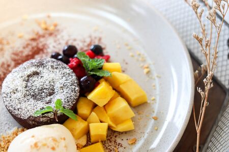chocolate cake with fresh fruit on top in coffee shop - soft focus point