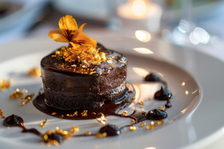 A beautifully crafted dessert showcases layers of chocolate and caramel, garnished with edible flowers and decorative elements, perfect for a fine dining experience.