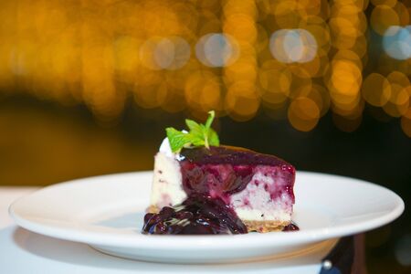 delicate cheesecake with berry mix on a white plate