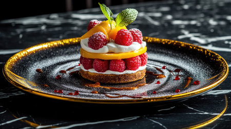 Delicious mango and raspberry fruit sandwich with fresh cream, plated on a gold-rimmed dish, luxury food photography