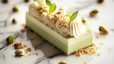 A piece of moist pistachio cake with delicate frosting and crushed nuts, elegantly plated on a marble surface.