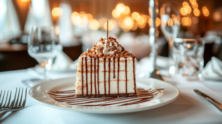 Elegant Slice of Layered Hazelnut Cake with Chocolate Sauce and Festive Bokeh Background