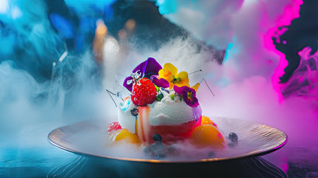 A vibrant nitrogen frozen dessert featuring colorful fruit gels and edible flowers is presented in swirling mist at a luxury restaurant.