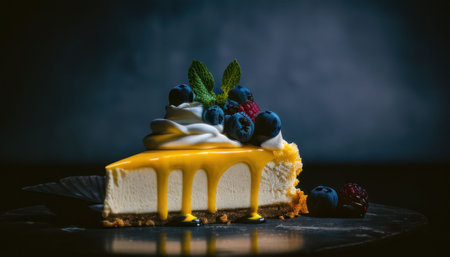 An AI generated illustration of a piece of delicious cheesecake with berries on the table