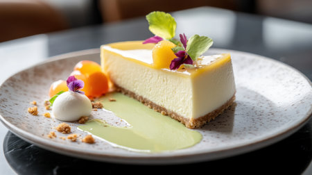Key lime pie with fresh apricot and mint on a plate