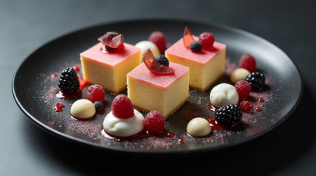Three elegant squares of creamy cake topped with vibrant raspberry and berry garnishes create a visually appealing dessert with a gourmet touch.