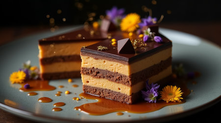 A sumptuous layered dessert featuring rich chocolate and creamy caramel, adorned with vibrant edible flowers and a glossy caramel drizzle, served on a decorative plate.