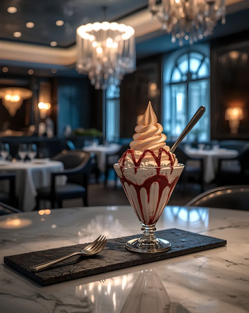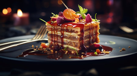 Haute cuisine dessert on restaurant table on dark backround. Generative AI.