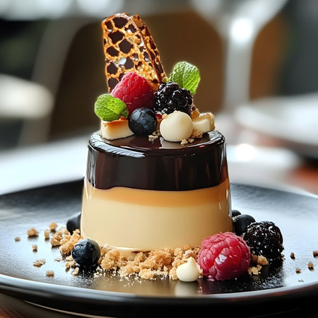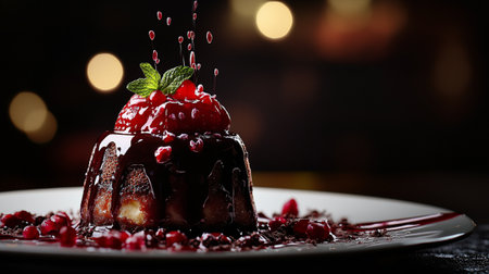 Chocolate mousse dessert with fresh berries and mint on black plate. Leyerd cake. selective focus. served in Michelin luxury restaurant. Smooth Textures and Glossy Finish. Modern food