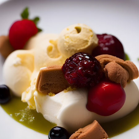 An AI generated illustration of A delectable dessert topped with fresh berries and a scoop of creamy ice cream, presented on a white plate