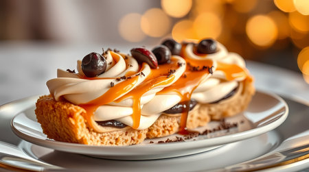 A beautiful cake with whipped cream and berries, drizzled with caramel and sprinkled with chocolate shavings. Generated by AI.
