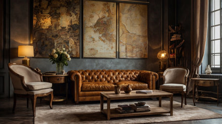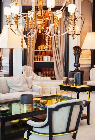 Luxury living room interior in classic style. Sofa, armchair, coffee table, window and curtains.