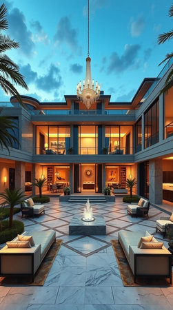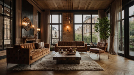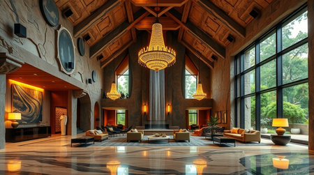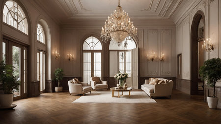 This image features a sophisticated grand hall with a large chandelier, expansive windows, and parquet wooden flooring, embodying elegance and historical charm in its intricate architectural design. AI generated image