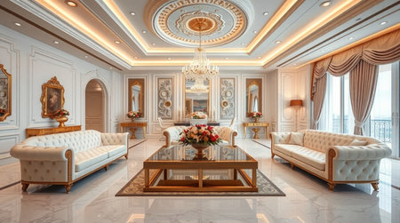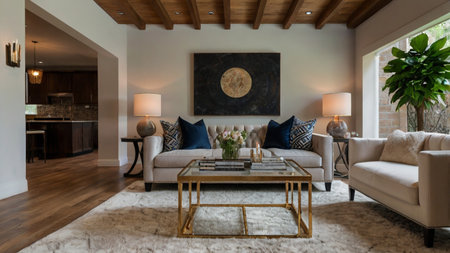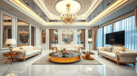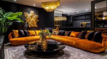 Bright and elegant living room featuring stylish furniture, gold accents, and reflective surfaces, creating a cozy and luxurious atmosphere perfect for relaxation and entertaining.