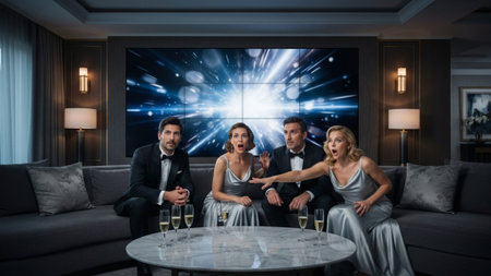 Cinematic wide environmental shot capturing four sophisticated adults in formal evening wear reactin