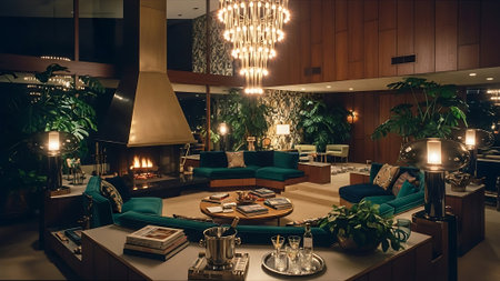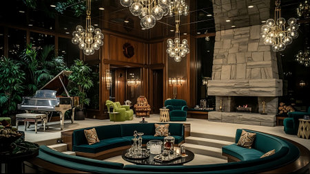 A luxurious lounge with elegant decor, featuring a grand fireplace, plush green seating, and artistic wall designs, illuminated by chandeliers