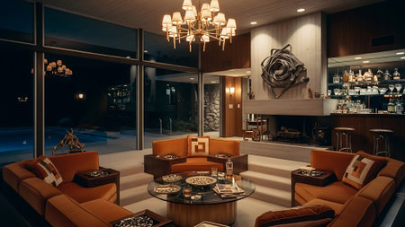 A modern living room with stylish furniture, abstract art, and a bar area, featuring a mix of textures and colors, creating a cozy yet sophisticated atmosphere