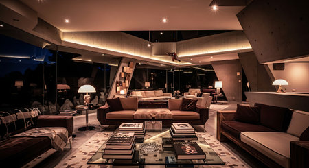 A luxurious living room on a yacht with modern furniture and warm lighting