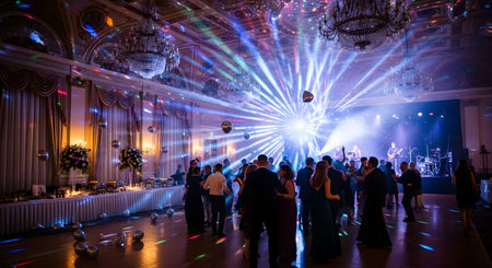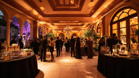 An elegant evening event, people in formal attire, beautifully decorated venue, capturing the essence of a sophisticated gathering. Resplendent.