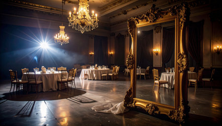 Wide shot, Ornate gold framed mirror reflecting deserted ballroom with crystal tables, dust sheets draped over chairs, single spotlight beam, hauntingly elegant decay