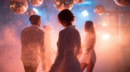 Dance party with vibrant lights and disco balls in an urban venue at night