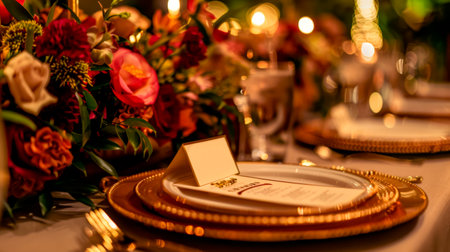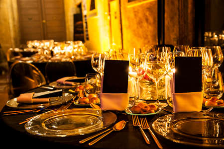 Luxury table settings for fine dining with and glassware, beautiful blurred background. Preparation for holiday Christmas and Hannukah dinner night.