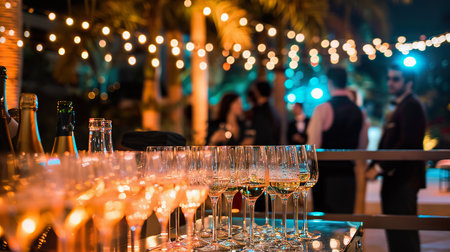 Elegant Outdoor Evening Event with String Lights and Wine Glasses.