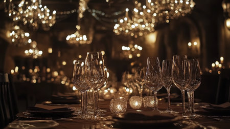 A beautifully arranged dinner table adorned with sparkling glassware, lit by soft candlelight. The warm ambiance creates an inviting and intimate atmosphere for guests.