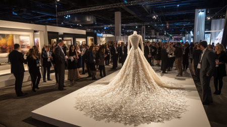 This stunning image captures an elegant wedding dress on display at a fashion event, showcasing intricate design and craftsmanship, with an attentive audience gathered around.