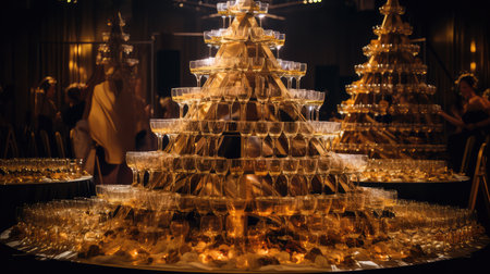 A festive reception with a large tower of champagne glasses, champagne flowing in a beautiful cascade, surrounded by elegant decor and soft lighting that creates a magical atmosphere.