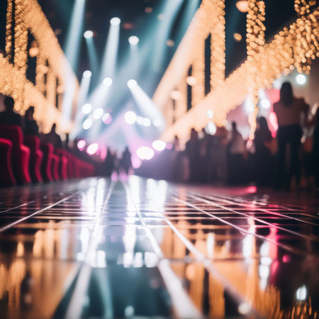 A captivating fashion show featuring models walking the runway in stunning outfits. The venue is illuminated with striking lights, creating a glamorous atmosphere.