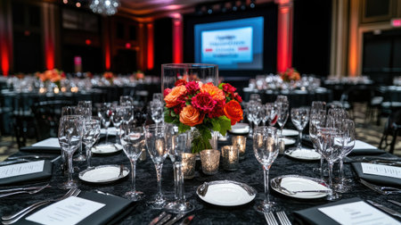 A banquet hall prepared for a charity event, with elegantly set tables, a silent auction area, and a stage with a lectern for speeches.