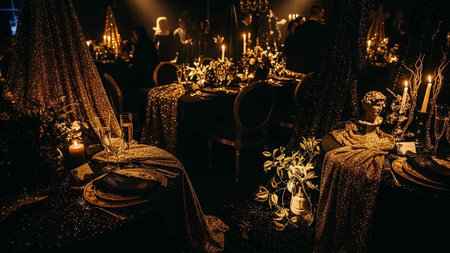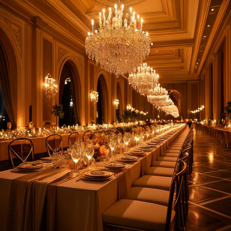 A long, ballroom is set with a grand banquet table stretching across the room, illuminated by dramatic spotlights and the warm glow of crystal chandeliers. Dark navy blue drapes adorn the walls, creating a rich backdrop for the meticulously set table with white floral arrangements and silver accents. Mirrored walls reflect the light and the attendees, enhancing the sense of grandeur and sophistication. The atmosphere is one of exclusive celebration and luxury.