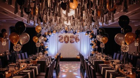 An interior scene showcases a festive arrangement with balloons in gold, black and silver colors. Overhead streamers and strings of lights add to the celebratory feel. Tables are set with decor, possibly for a special occasion. This image could be used for event planning materials or holiday promotions.