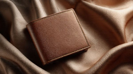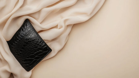 A chic black wallet elegantly rests atop soft beige fabric, creating a stylish and minimalistic arrangement perfect for fashion presentations.