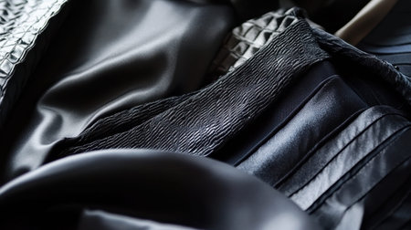 This image showcases an intricate arrangement of black fabrics, emphasizing the rich textures and luxurious materials used in modern fashion design.