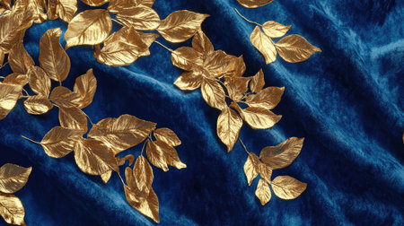 This captivating image showcases intricate golden leaves delicately arranged on a rich blue velvet background, perfect for elegant designs and decorations.