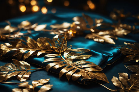 Golden leaves on blue fabric with bokeh lights. Luxury background
