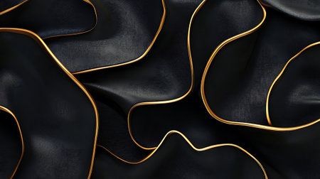 This abstract showcases multiple layers of black fabric, intricately folded and curved to resemble a topographical landscape. Fine, gleaming gold lines are embedded within the folds, accentuating the contours and adding a touch of luxury. The interplay of light and shadow across the textured fabric creates a sense of depth and volume. The overall effect is one of organic abstraction with a rich, feel.