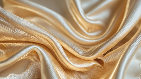 AI Generated. Luxurious golden silk fabric with elegant waves and shimmering texture perfect for background or text overlay in creative design projects
