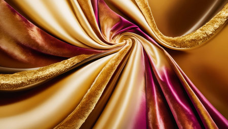Close-up of rich velvet and satin fabric in gold, magenta, and bronze tones twisted into a spiral. Perfect for luxury, textile, interior, or fashion concepts