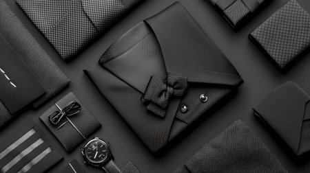 Monochrome flat lay of black tuxedo pieces with geometric spacing
