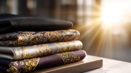 A captivating arrangement of layered fabrics showcases intricate patterns and rich textures, illuminated by soft sunlight creating a warm atmosphere.