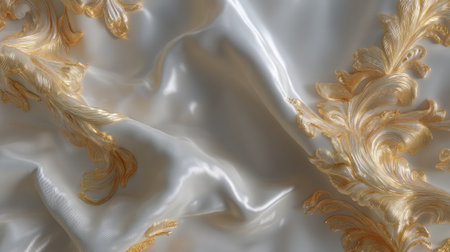 A close-up of luxurious satin fabric showcases intricate gold embroidery featuring floral and leaf motifs, highlighting elegance and stunning textures for various design uses.